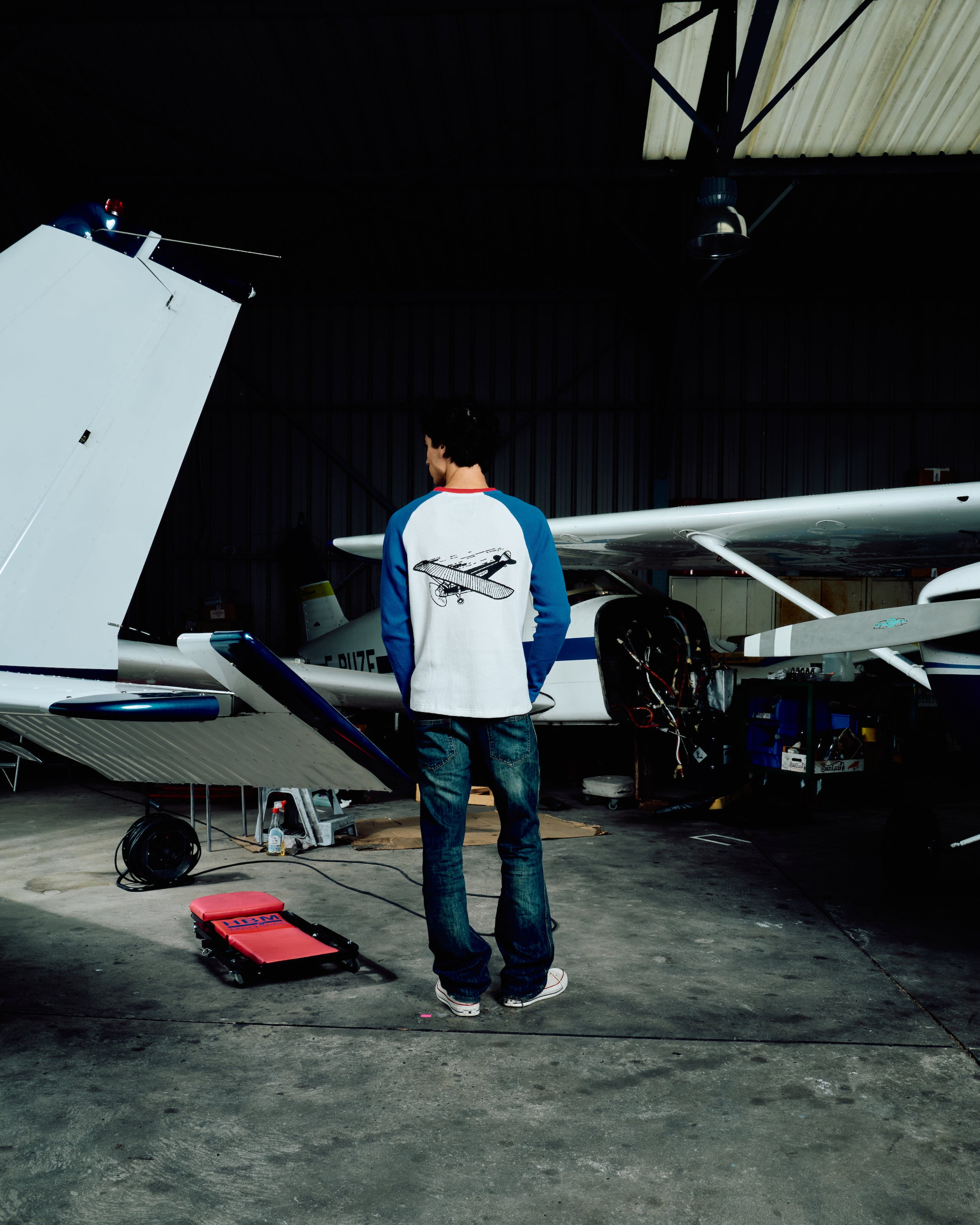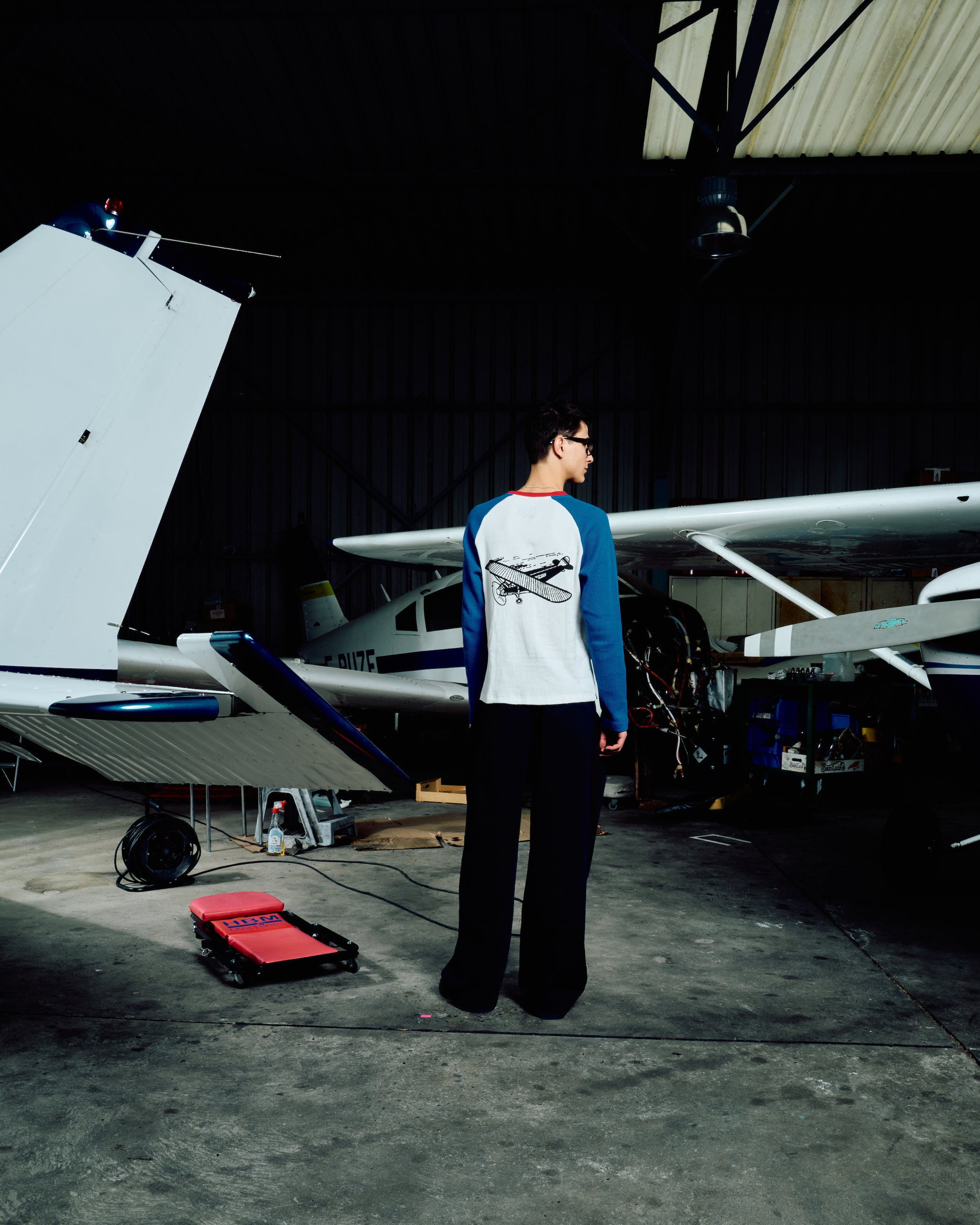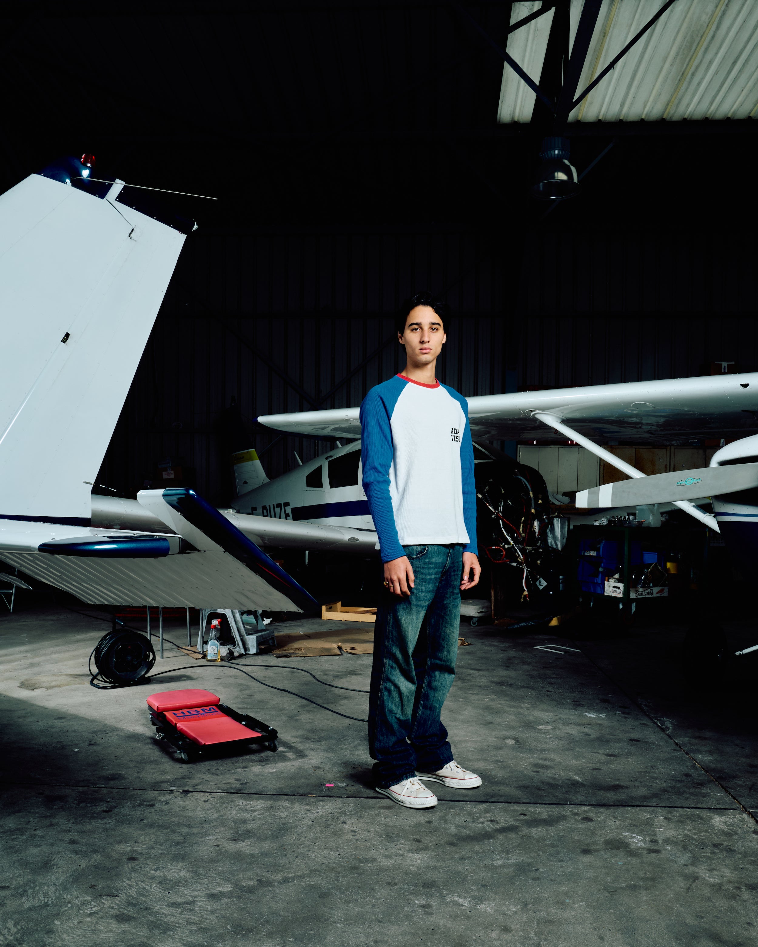 Oscar is wearing a size S and is 1m85