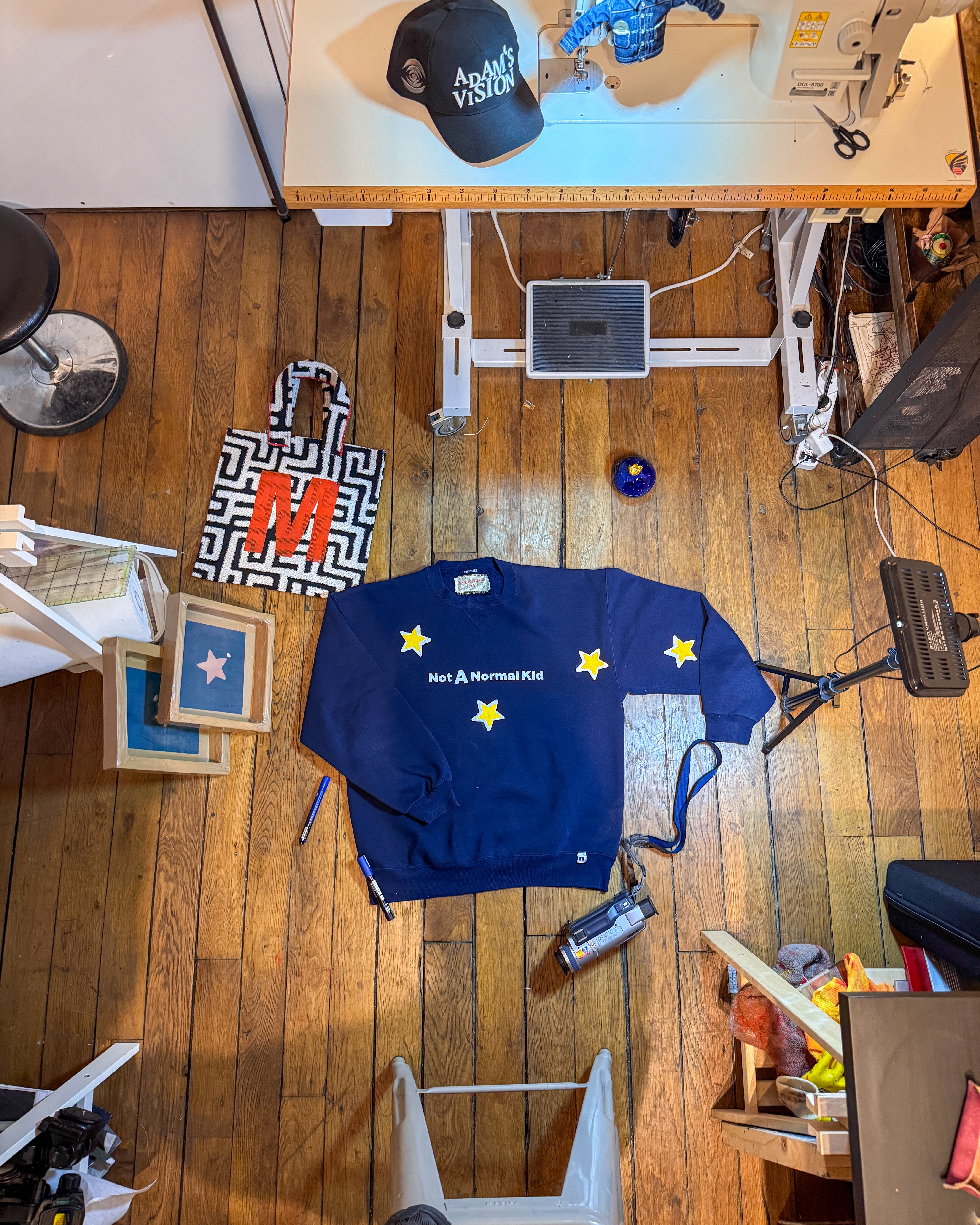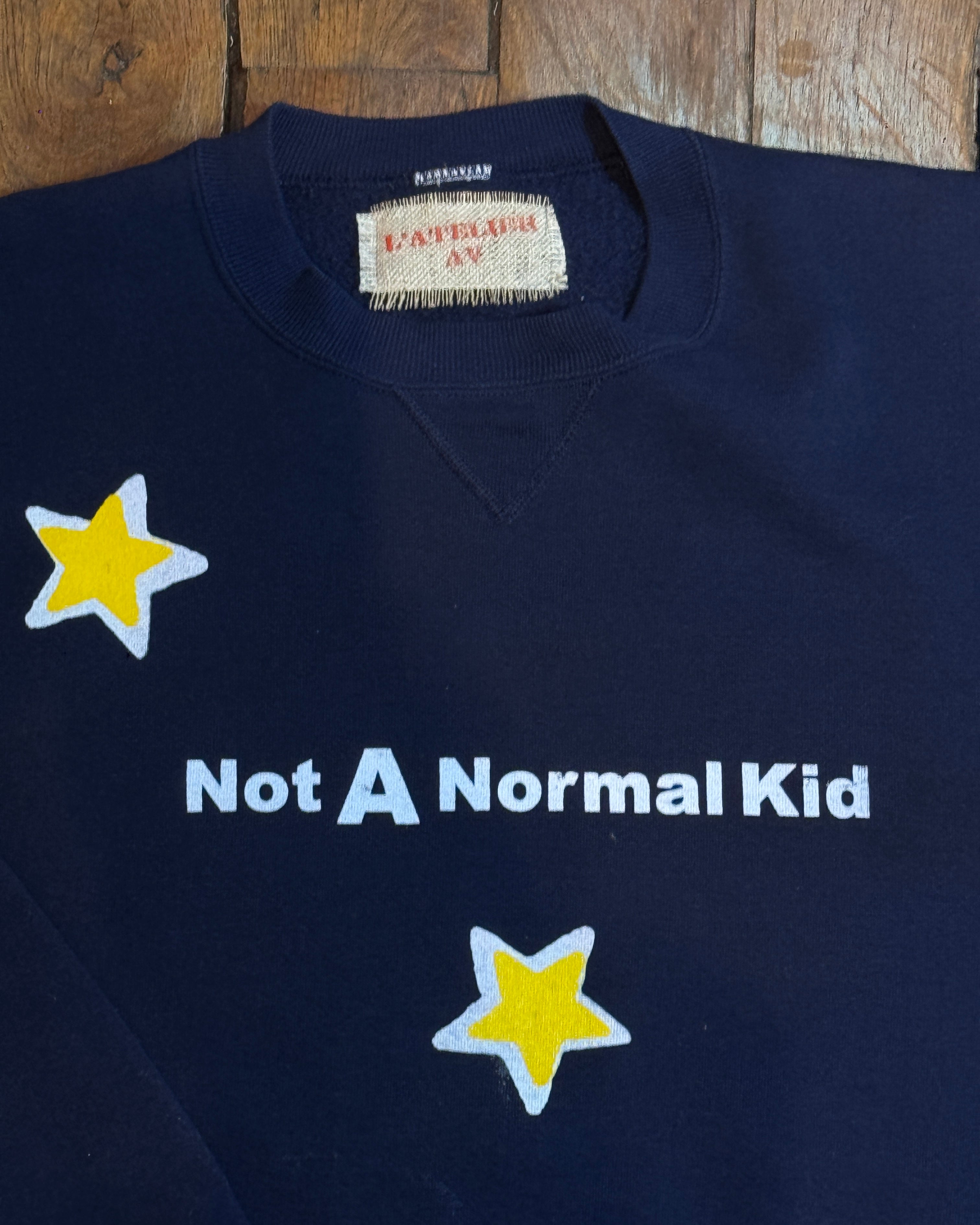 It is a unique piece featuring overlayed white and yellow screen-printed stars and the Not A Normal Kid logo screen-printed in white.